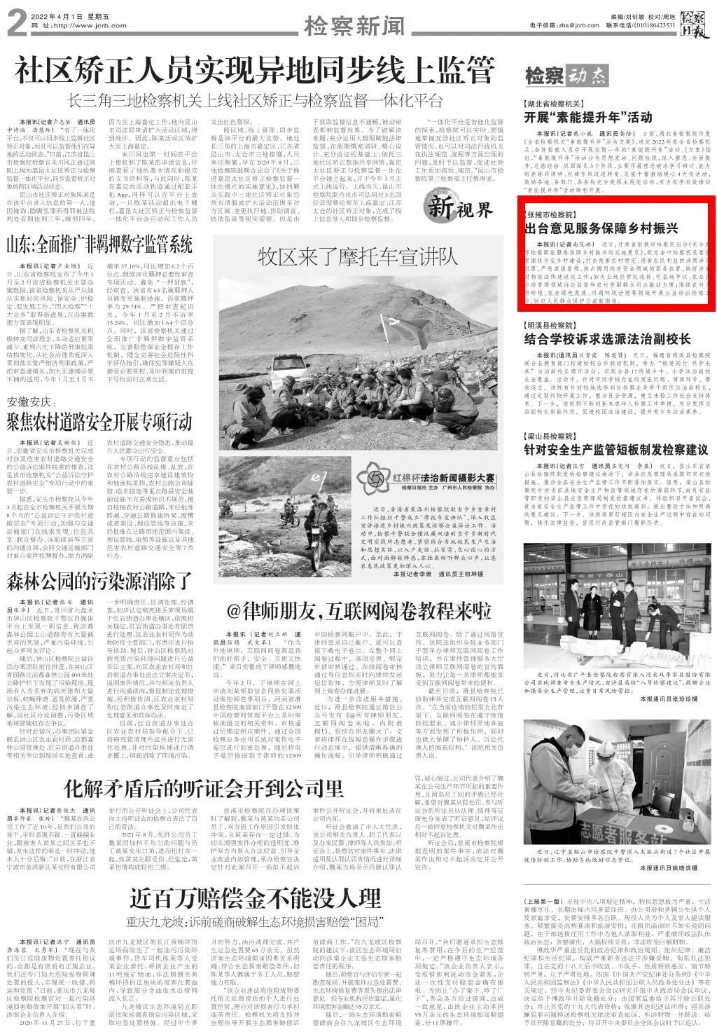2022年4月1日检察日报二版刊发《张掖市检察院:出台意见服务保障乡村振兴》。