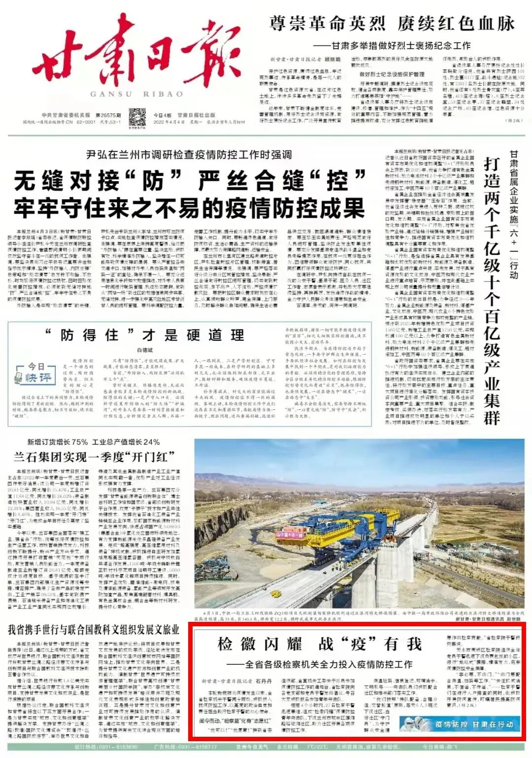 2022年4月4日,甘肃日报头版、二版刊发新闻《检徽闪耀 战“疫”有我——全省各级检察机关全力投入疫情防控工作》。