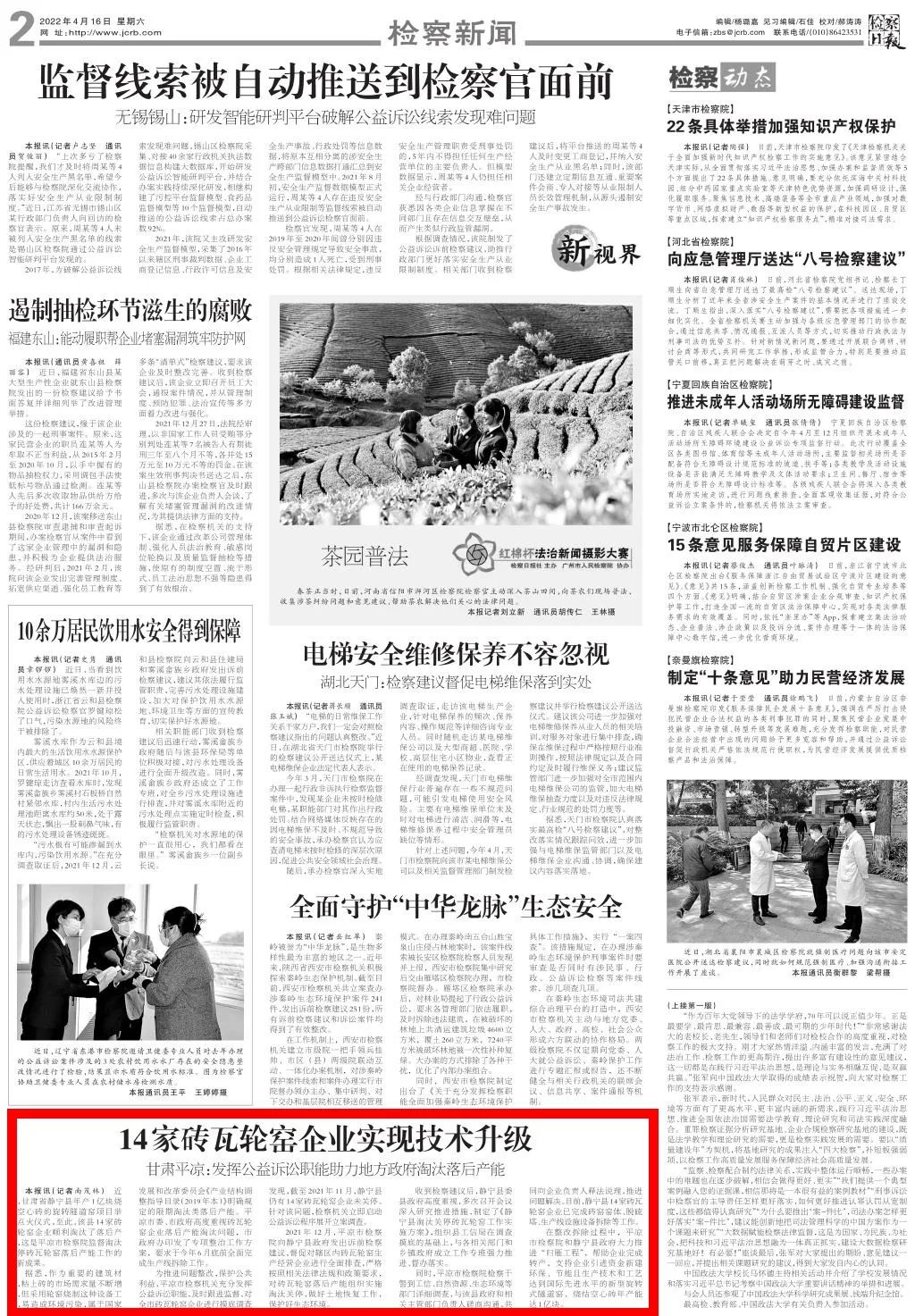 2022年4月16日,检察日报二版刊发新闻《14家砖瓦轮窑企业实现技术升级——甘肃平凉:发挥公益诉讼职能助力地方政府淘汰落后产能》。