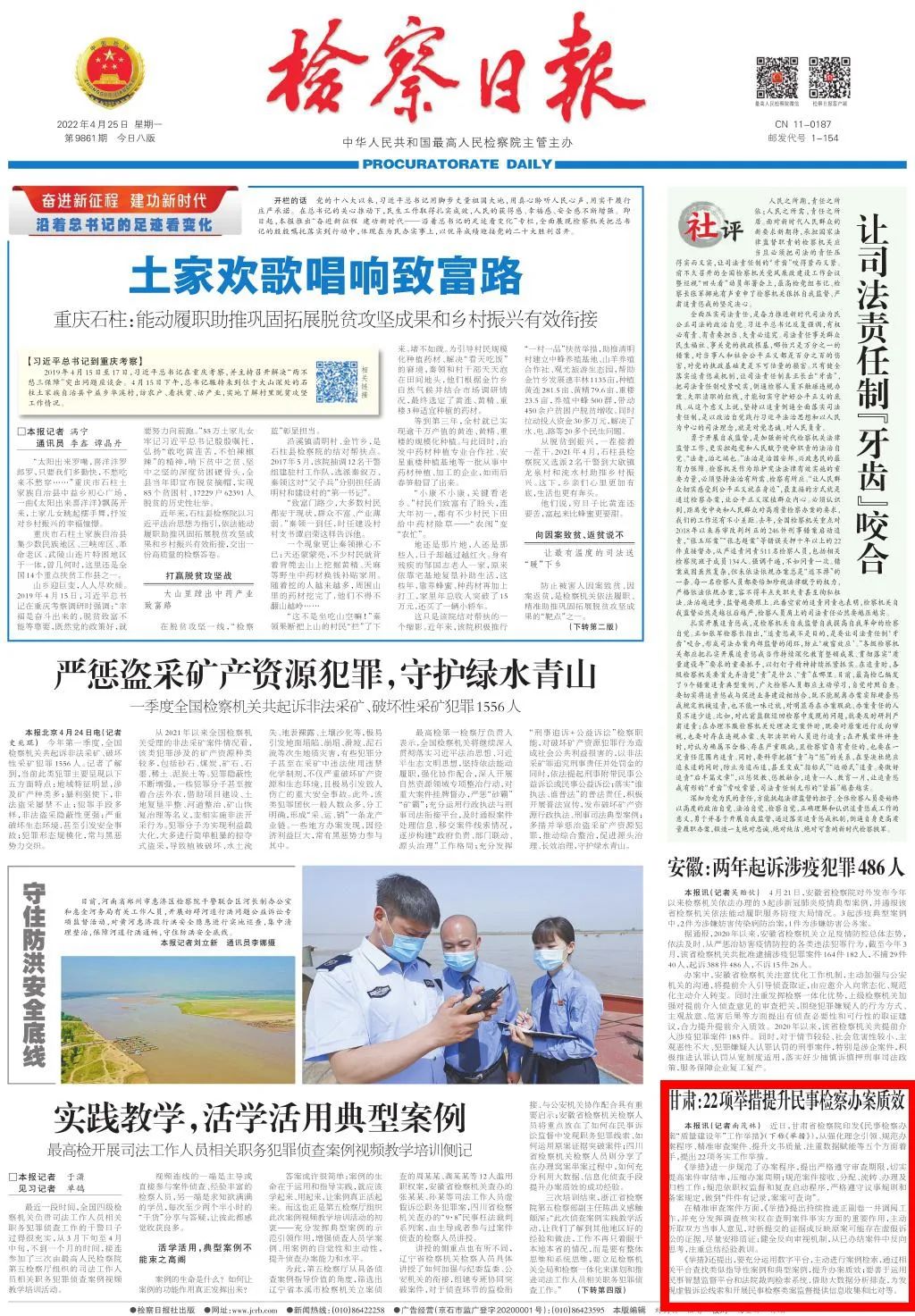 2022年4月25日,检察日报头版刊发新闻《甘肃:22项举措提升民事检察办案质效》。