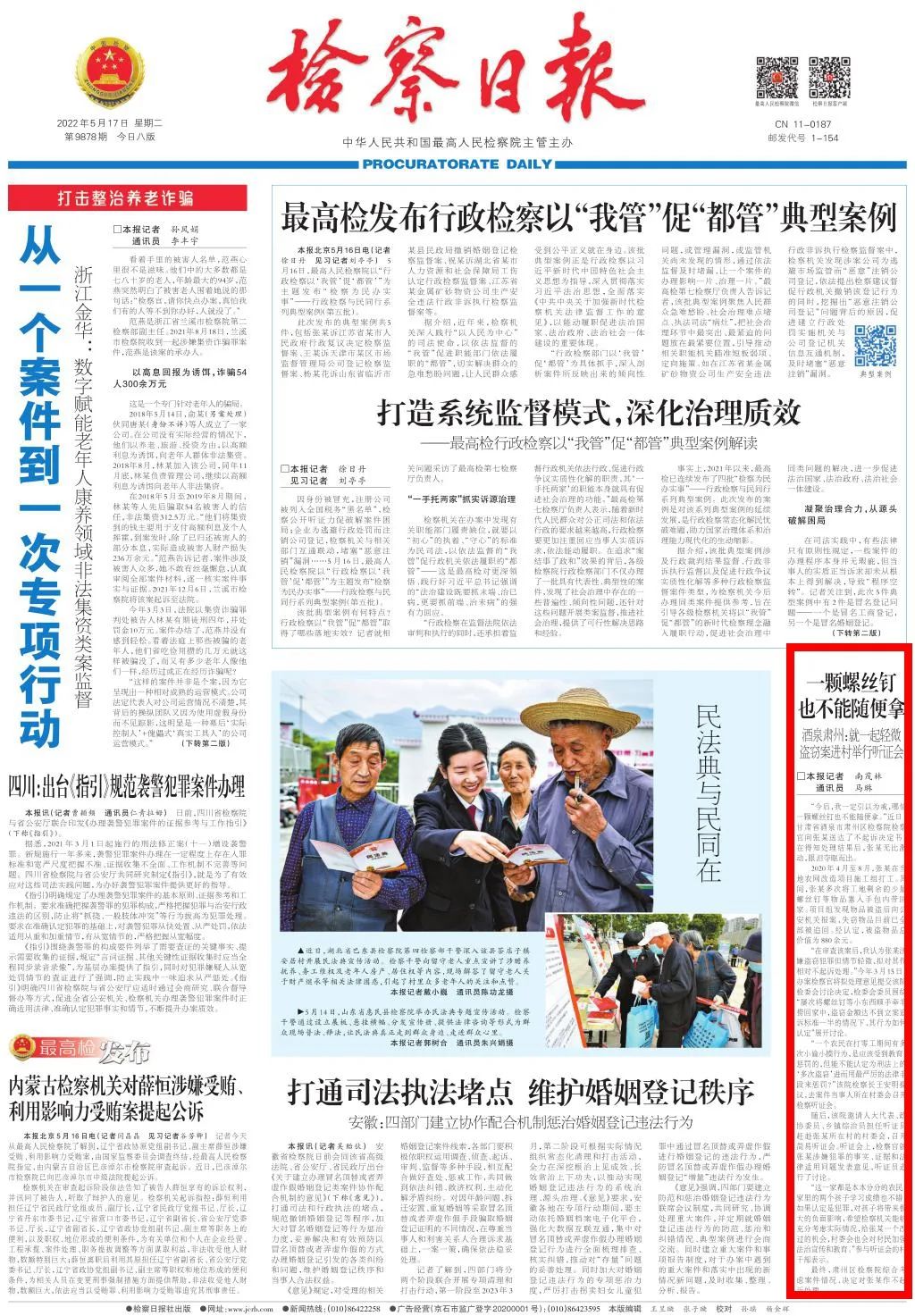 2022年5月17日,检察日报头版刊发《一颗螺丝钉也不能随便拿——酒泉肃州:就一起轻微盗窃案进村举行听证会》。