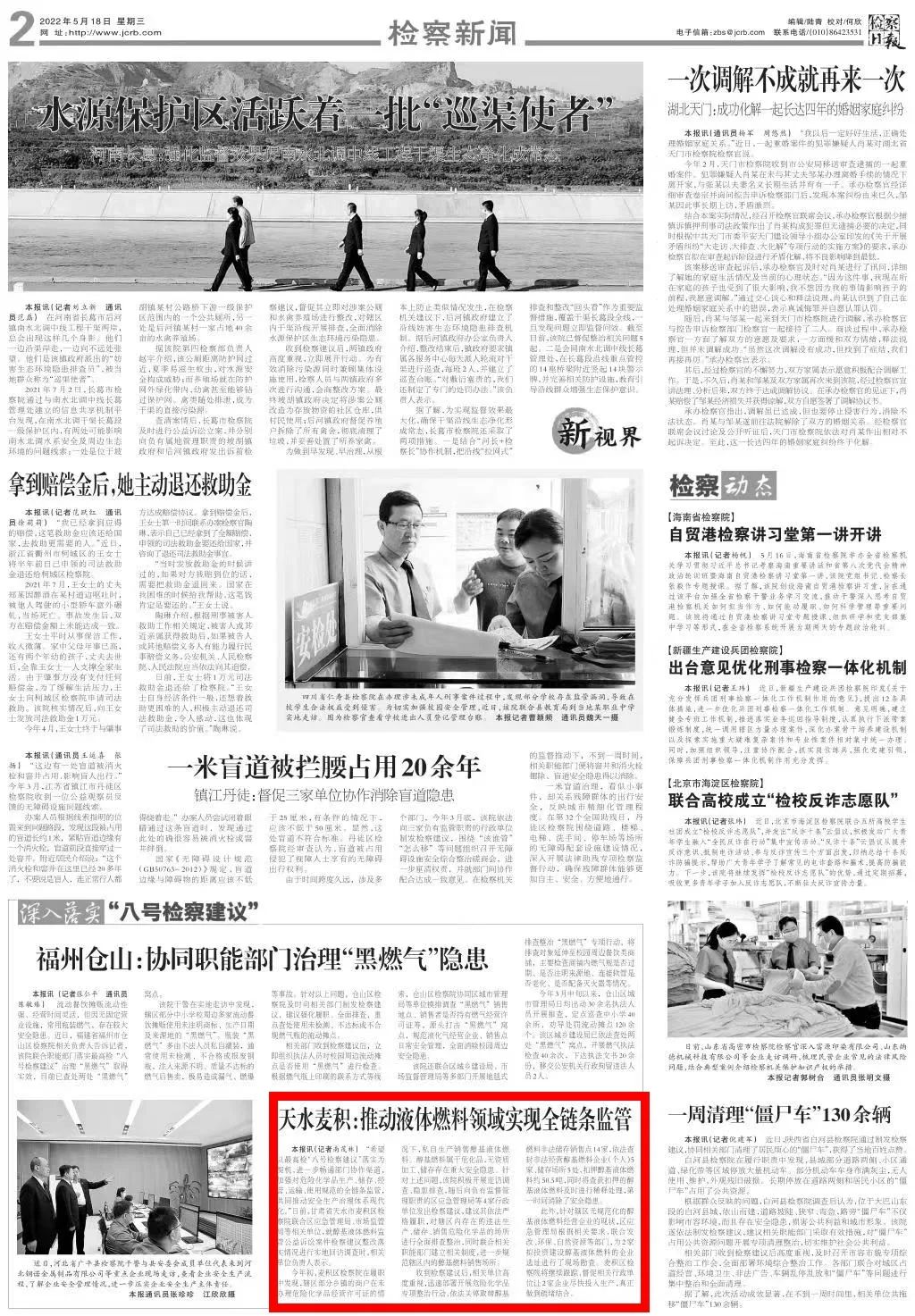 2022年5月18日,检察日报二版刊发《天水麦积:推动液体燃料领域实现全链条监管》。