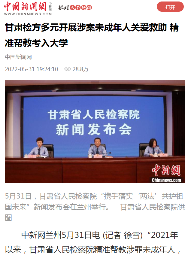 2022年5月31日,中国新闻网发布《甘肃检方多元开展涉案未成年人关爱救助 精准帮教考入大学》。