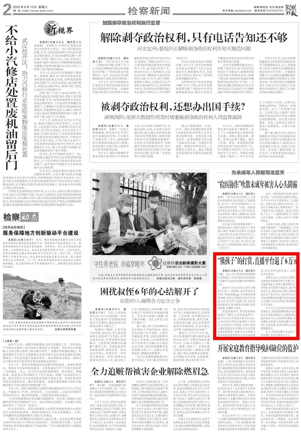 2022年6月15日,检察日报二版刊发《“熊孩子”的打赏,直播平台退了6万元》。