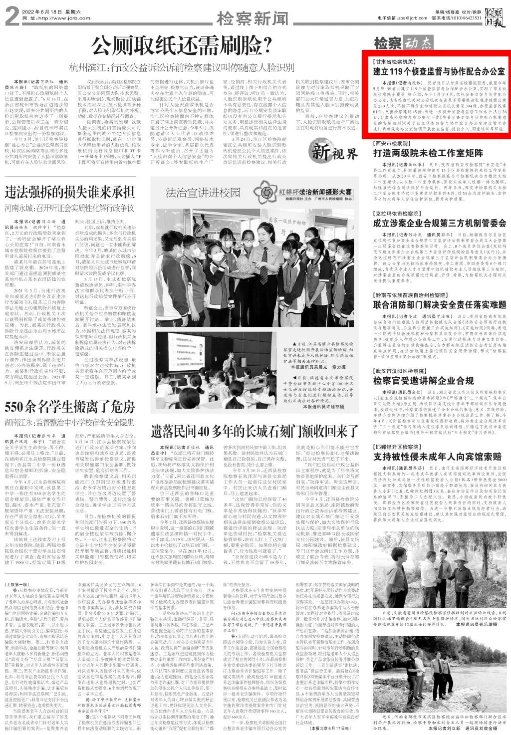2022年6月18日,检察日报二版刊发《甘肃省检察机关:建立119个侦查监督与协作配合办公室》。