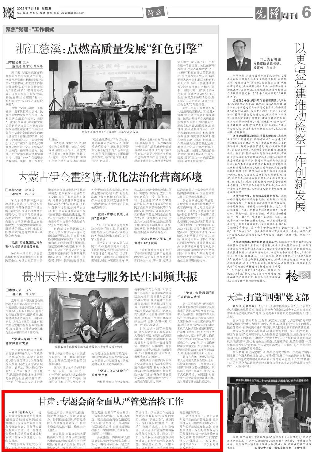 2022年7月8日,检察日报六版刊发《甘肃:专题会商全面从严管党治检工作》。