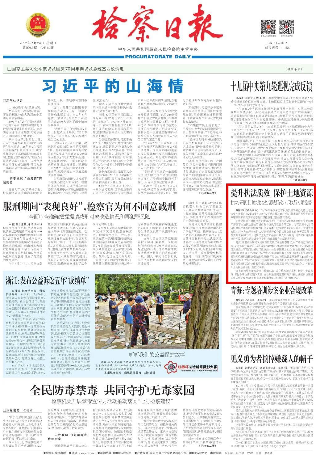 2022年7月24日,检察日报头版刊发《提升执法质效 保护土地资源——甘肃:开展土地执法查处领域行政非诉执行专项监督》。