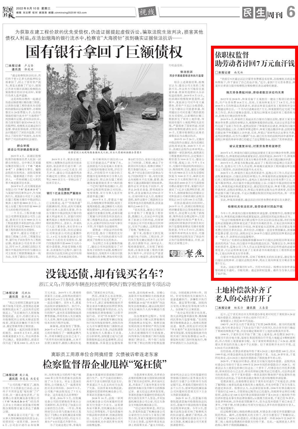 2022年8月10日,检察日报民生周刊刊发《依职权监督 助劳动者讨回7万元血汗钱》。