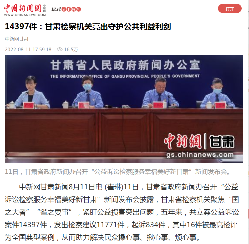 中新网甘肃新闻8月11日电 (崔琳)11日,甘肃省政府新闻办召开“公益诉讼检察服务幸福美好新甘肃”新闻发布会披露,甘肃省检察机关聚焦“国之大者”“省之要事”,紧盯公益损害突出问题,五年来,共立案公益诉讼案件14397件,发出检察建议11771件,起诉834件,其中16件被最高检评为全国典型案例,从而助力解决民众操心事、揪心事、烦心事。