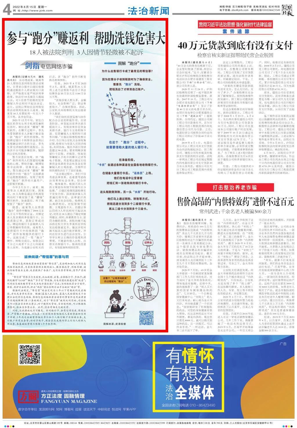 2022年8月15日,检察日报四版刊发《参与“跑分”赚返利 帮助洗钱危害大——18人被法院判刑 3人因情节轻微被不起诉》。
