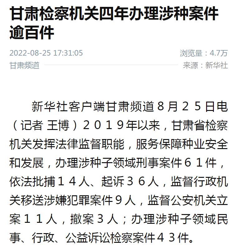 新华社客户端甘肃频道8月25日电(记者 王博)2019年以来,甘肃省检察机关发挥法律监督职能,服务保障种业安全和发展,办理涉种子领域刑事案件61件,依法批捕14人、起诉36人,监督行政机关移送涉嫌犯罪案件9人,监督公安机关立案11人,撤案3人;办理涉种子领域民事、行政、公益诉讼检察案件43件。