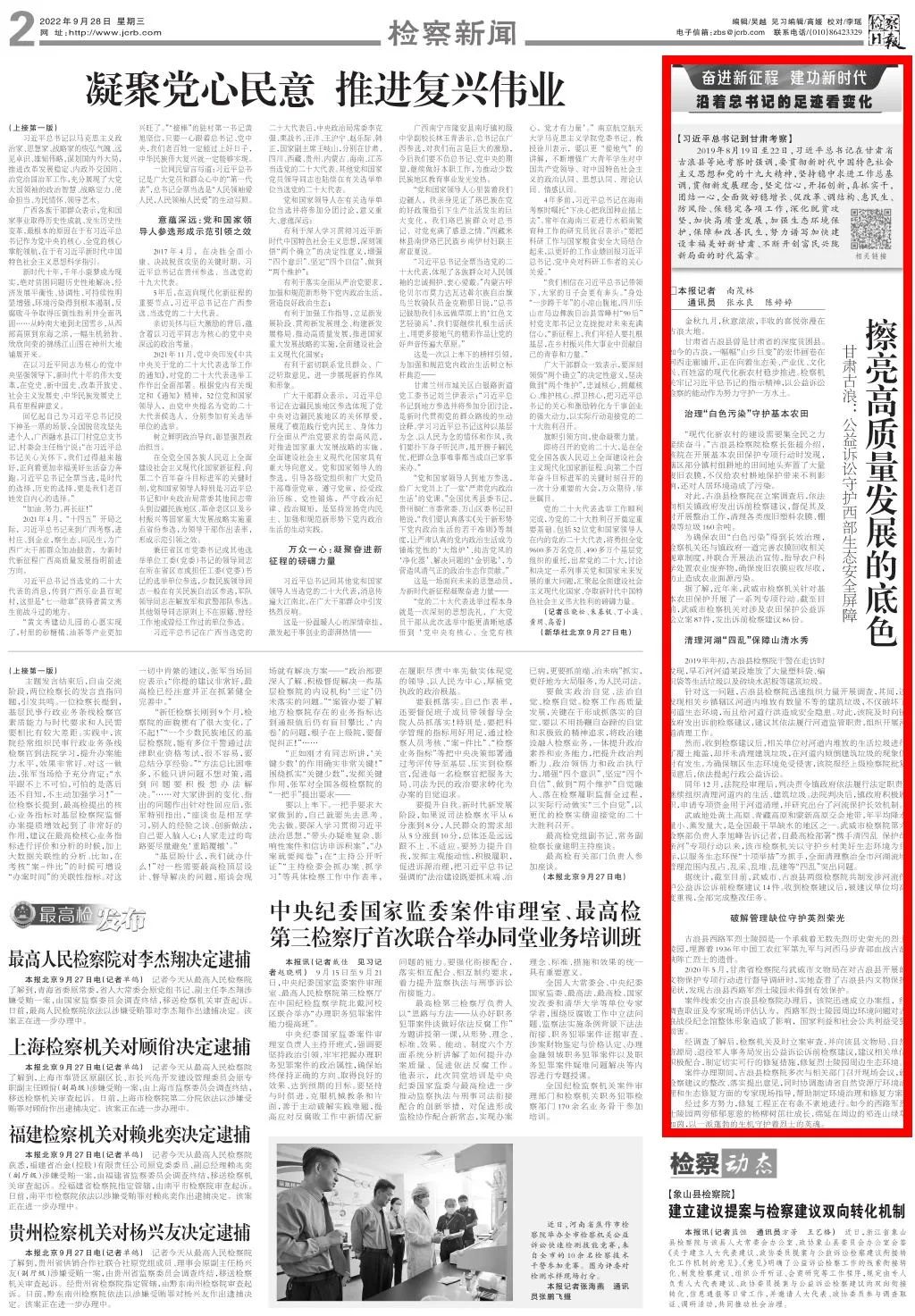 2022年9月28日,检察日报二版刊发《擦亮高质量发展的底色——甘肃古浪:公益诉讼守护西部生态安全屏障》。
