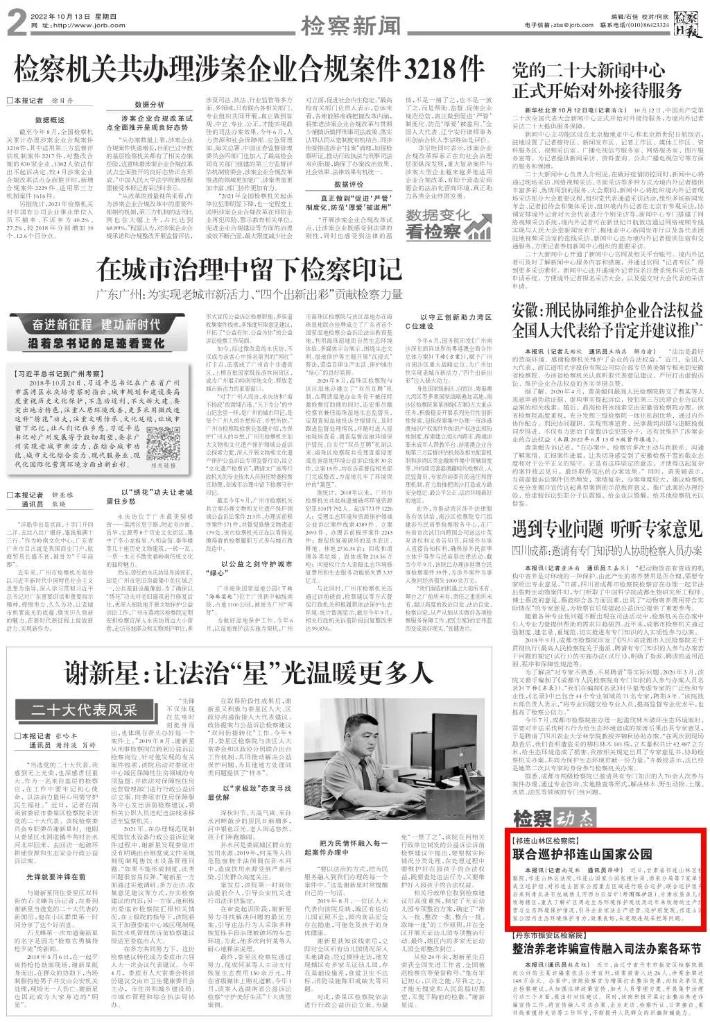 2022年10月13日,检察日报二版刊发《祁连山林区检察院:联合巡护祁连山国家公园》。