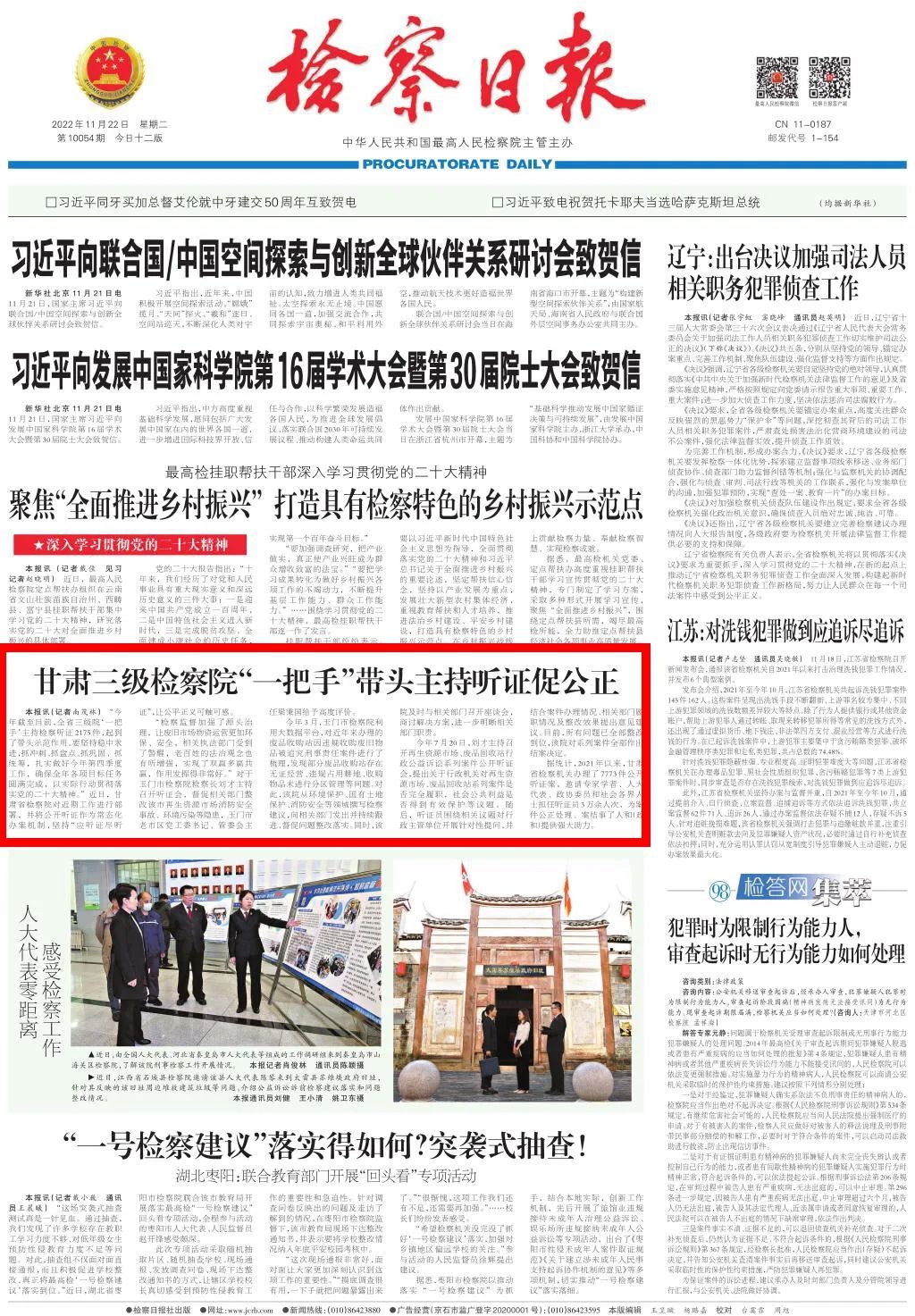 2022年11月22日,检察日报头版刊发《甘肃三级检察院“一把手”带头主持听证促公正》。