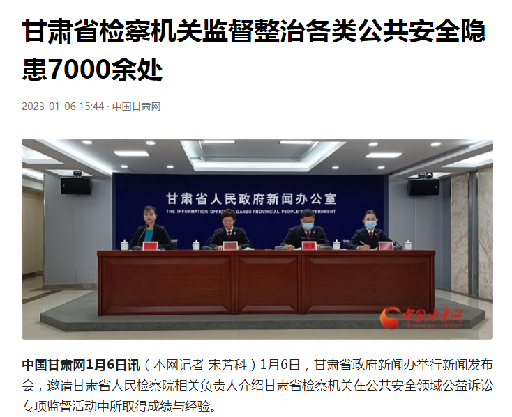 2023年1月6日,中国甘肃网发布《甘肃省检察机关监督整治各类公共安全隐患7000余处》。