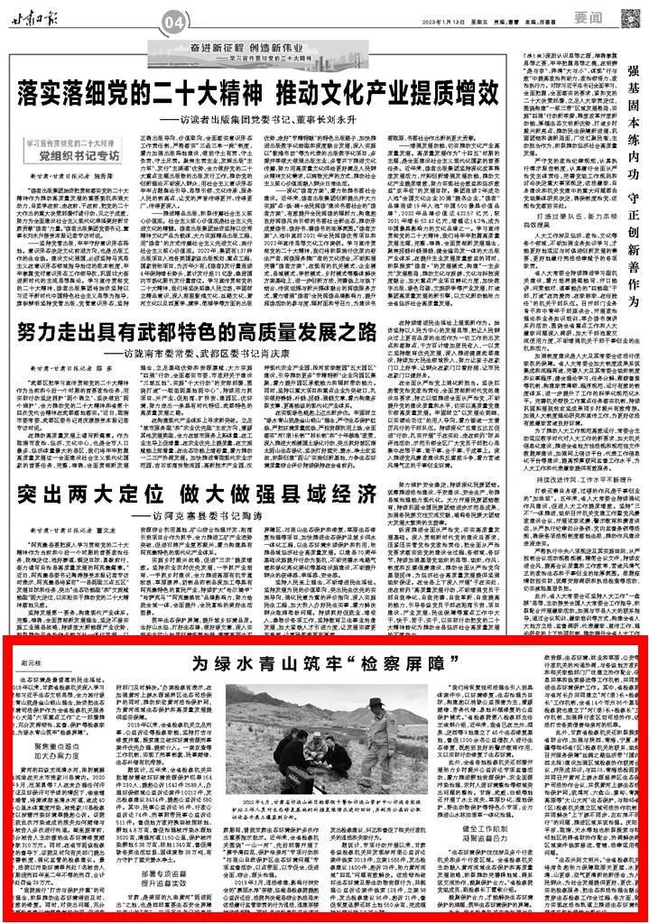 2023年1月13日,甘肃日报四版刊发《为绿水青山筑牢“检察屏障”》。