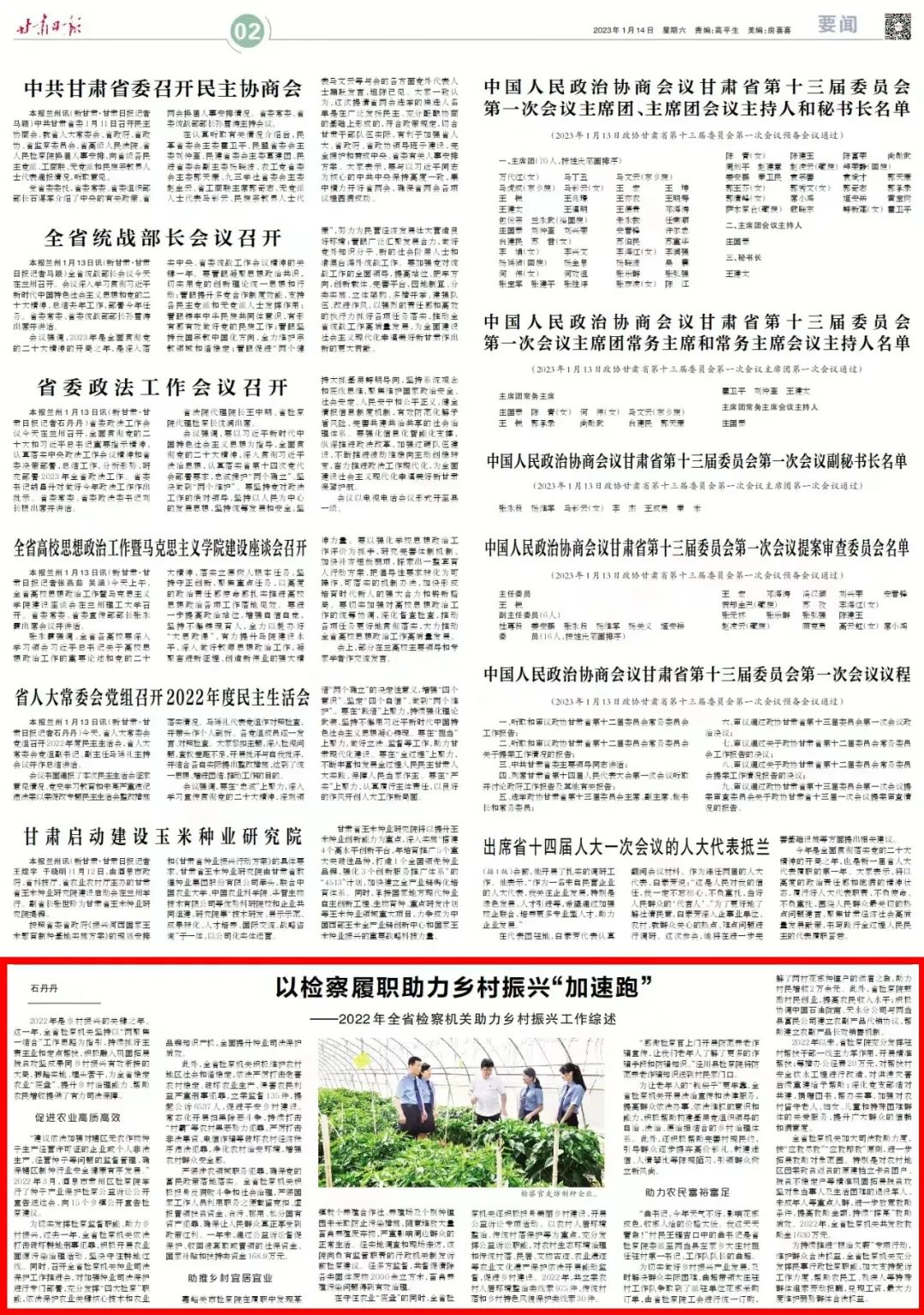 2023年1月14日,甘肃日报头版刊发《以检察履职助力乡村振兴“加速跑”——2022年全省检察机关助力乡村振兴工作综述》。