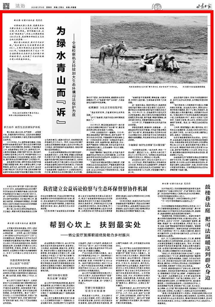 2023年2月9日,甘肃日报五版刊发《为绿水青山而“诉”——全省检察机关持续加大生态环境司法保护力度》。