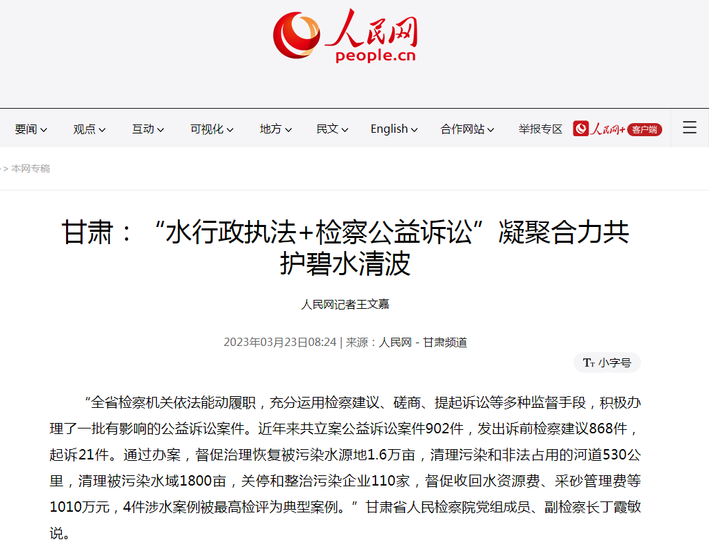 2023年3月23日,人民网发布《甘肃:“水行政执法+检察公益诉讼”凝聚合力共护碧水清波》。