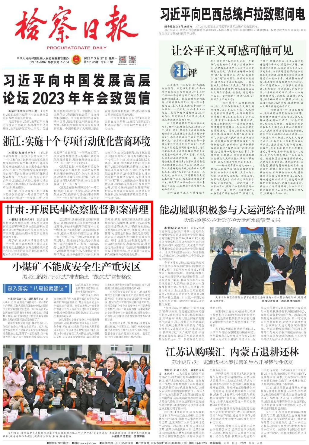 2023年3月27日,检察日报头版刊发《甘肃:开展民事检察监督积案清理》。