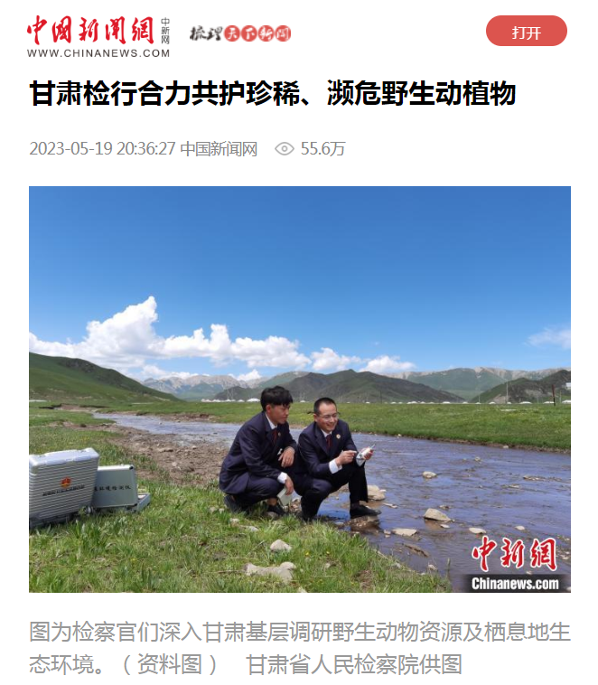 2023年5月19日,中国新闻网发布《甘肃检行合力共护珍稀、濒危野生动植物》。