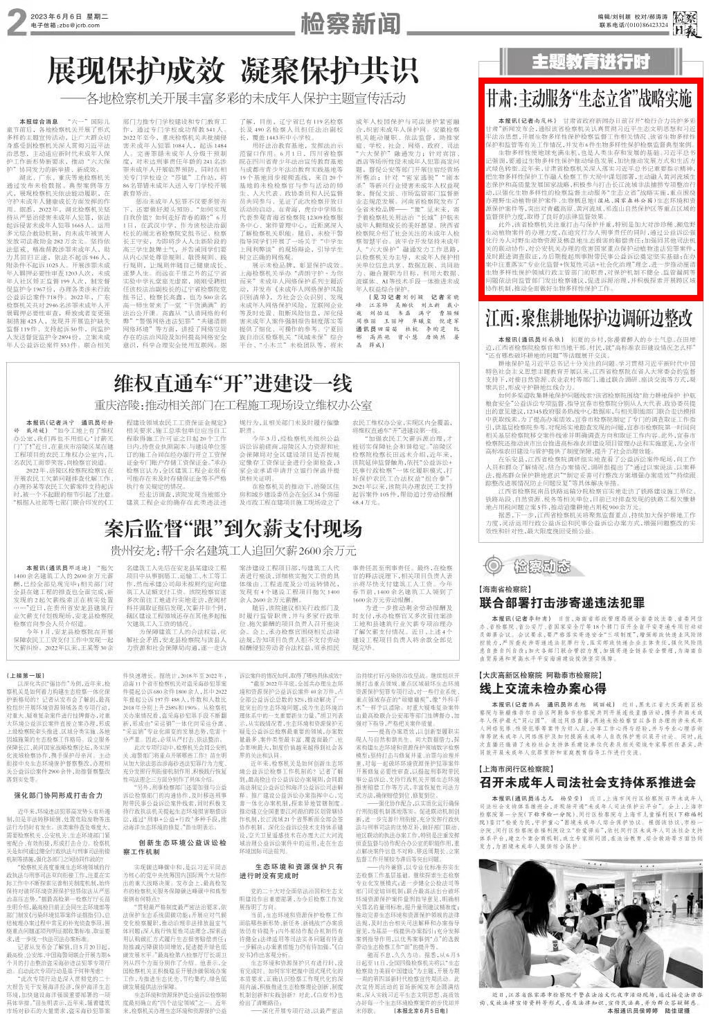 2023年6月6日,检察日报二版刊发《甘肃:主动服务“生态立省”战略实施》。