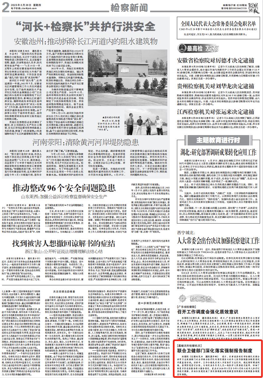 2023年6月29日,检察日报二版刊发《嘉峪关市检察机关联合卫健部门深化落实强制报告制度》。