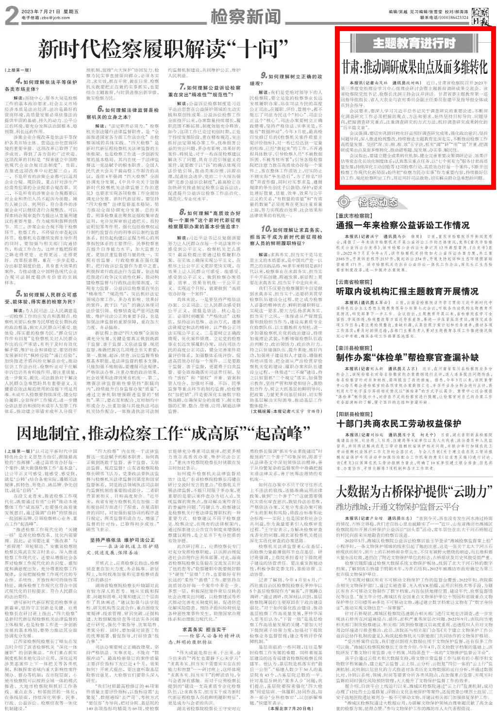 2023年7月21日,检察日报二版《主题教育进行时》专栏刊发《甘肃:推动调研成果由点及面多维转化》。