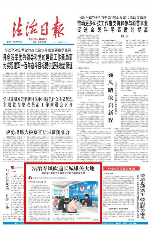2023年7月22日,法治日报头版刊发《法治春风吹遍长城雄关大地——嘉峪关以基础性先导性普法助力高质量发展》。