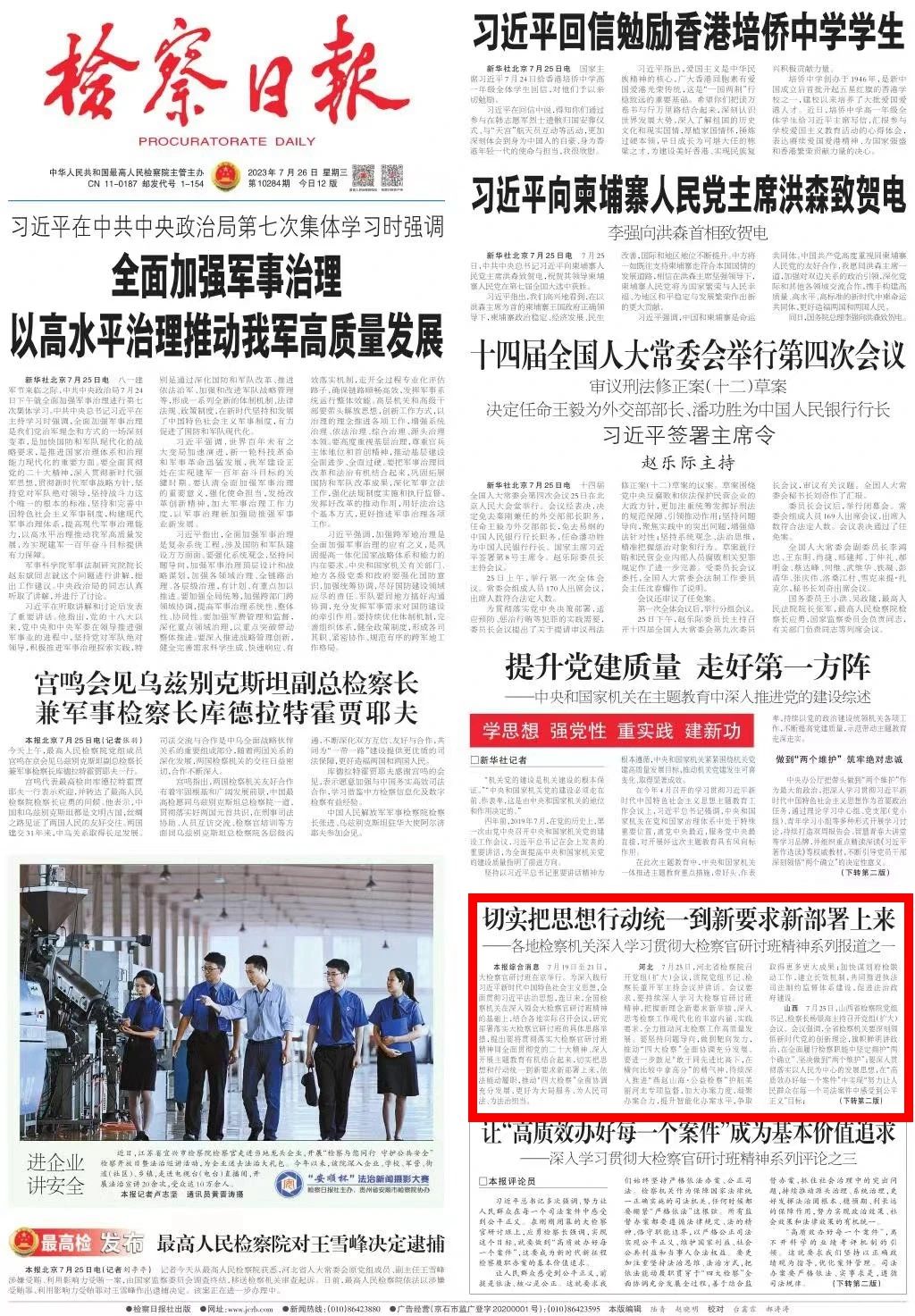 2023年7月26日,检察日报头版刊发《切实把思想行动统一到新要求新部署上来——各地检察机关深入学习贯彻大检察官研讨班精神系列报道之一》。