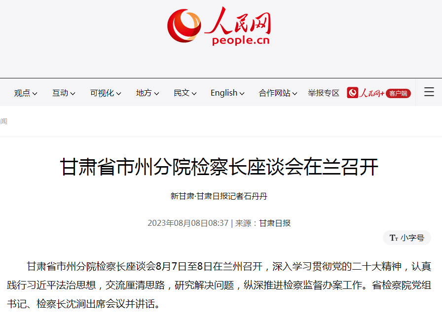 2023年8月8日,人民网发布《甘肃省市州分院检察长座谈会在兰召开》。