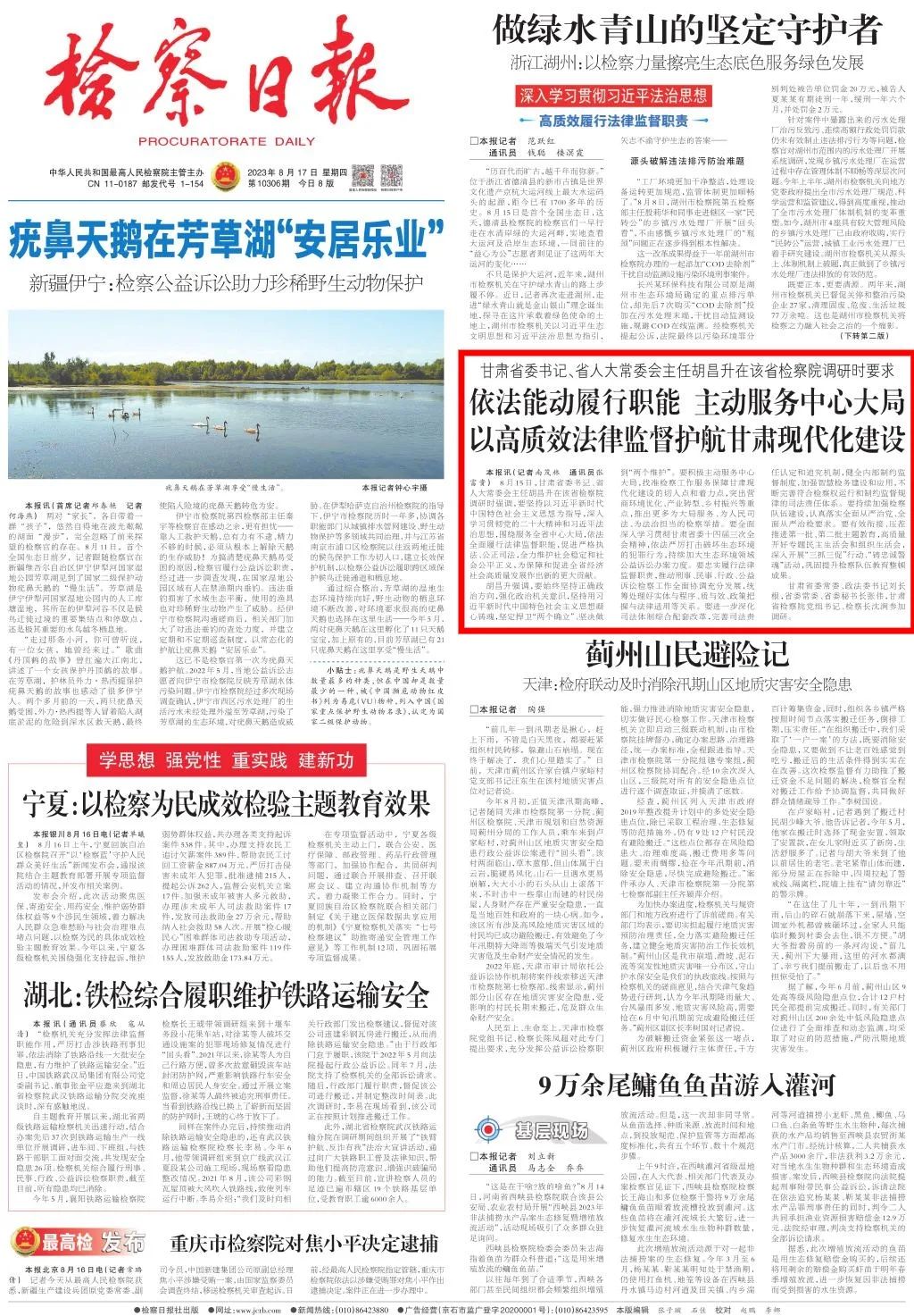 2023年8月17日,检察日报头版刊发《甘肃省委书记、省人大常委会主任胡昌升在该澳门彩