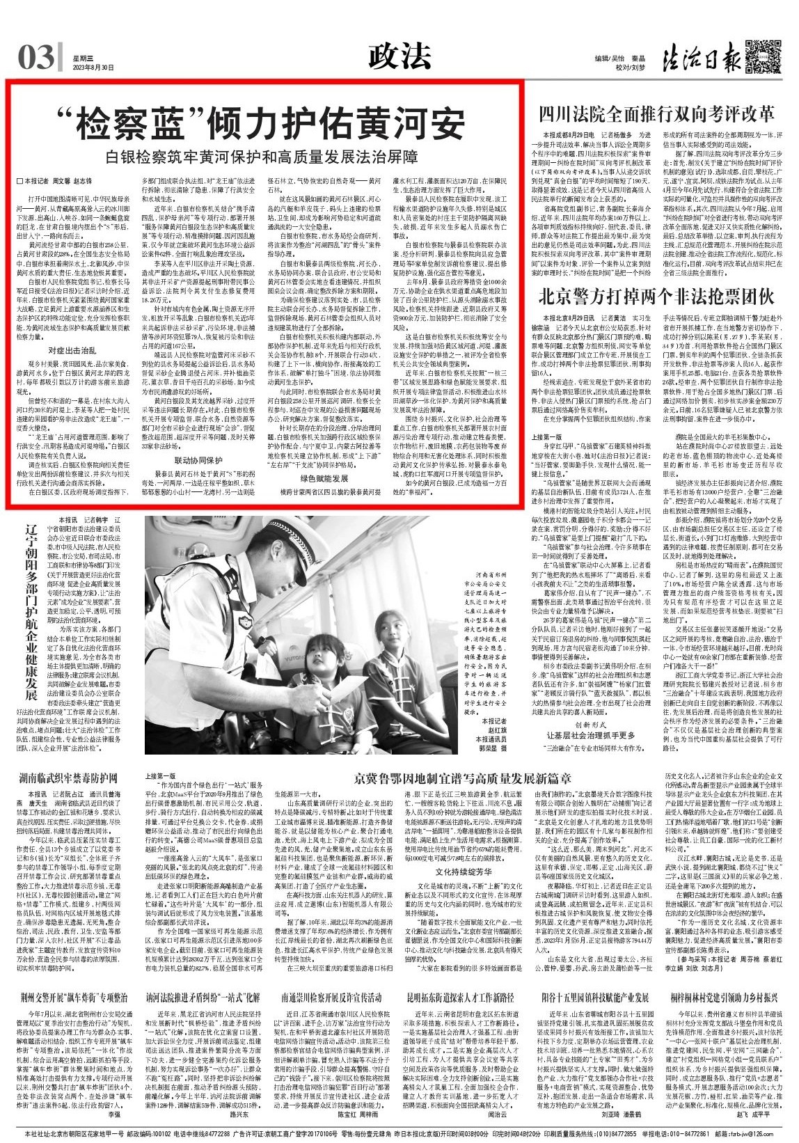 2023年8月30日,法治日报刊发《“检察蓝”倾力护佑黄河安——白银检察筑牢黄河保护和高质量发展法治屏障》。