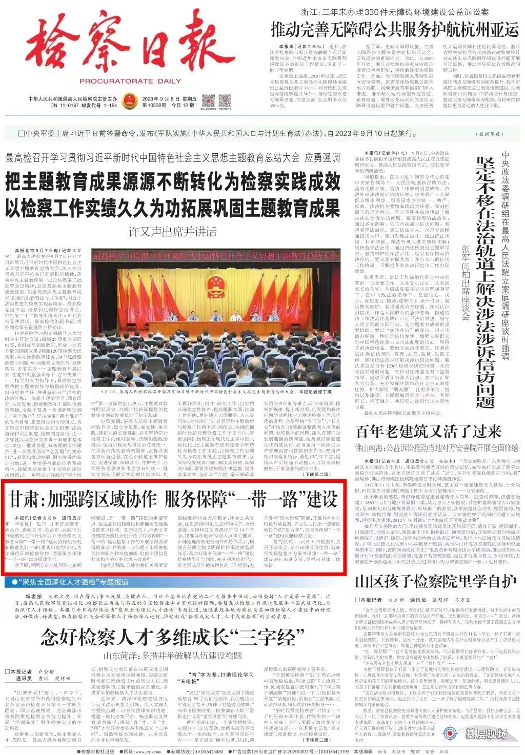2023年9月8日,检察日报头版刊发《甘肃:加强跨区域协作 服务保障“一带一路”建设》。