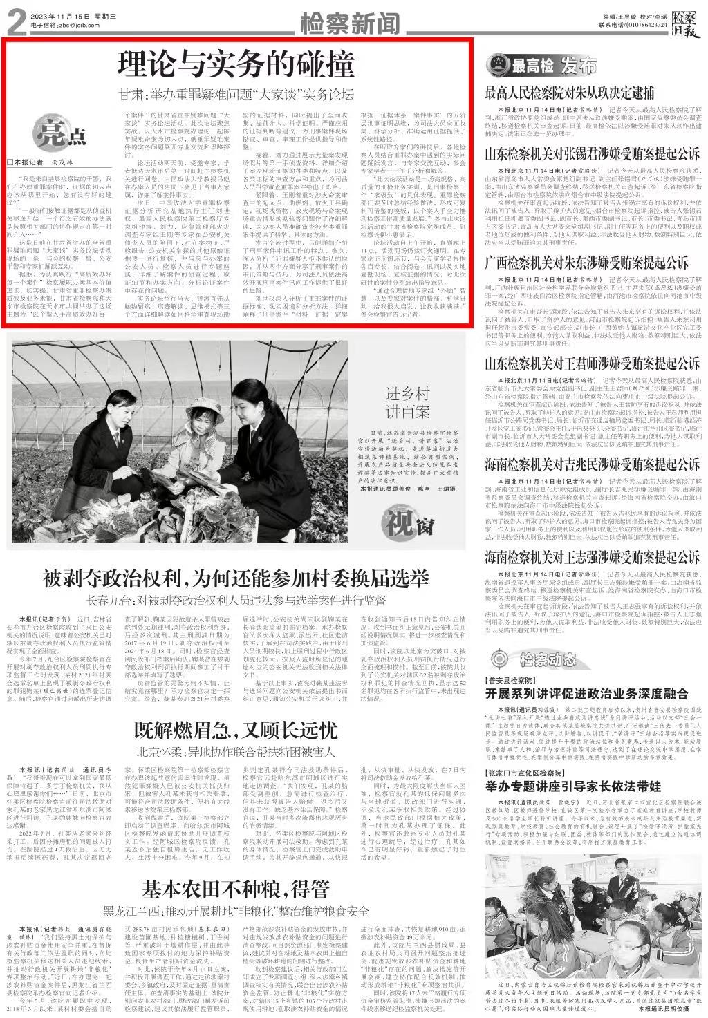 2023年11月15日,检察日报二版头条刊发《理论与实务的碰撞——甘肃:举办重罪疑难问题“大家谈”实务论坛》。