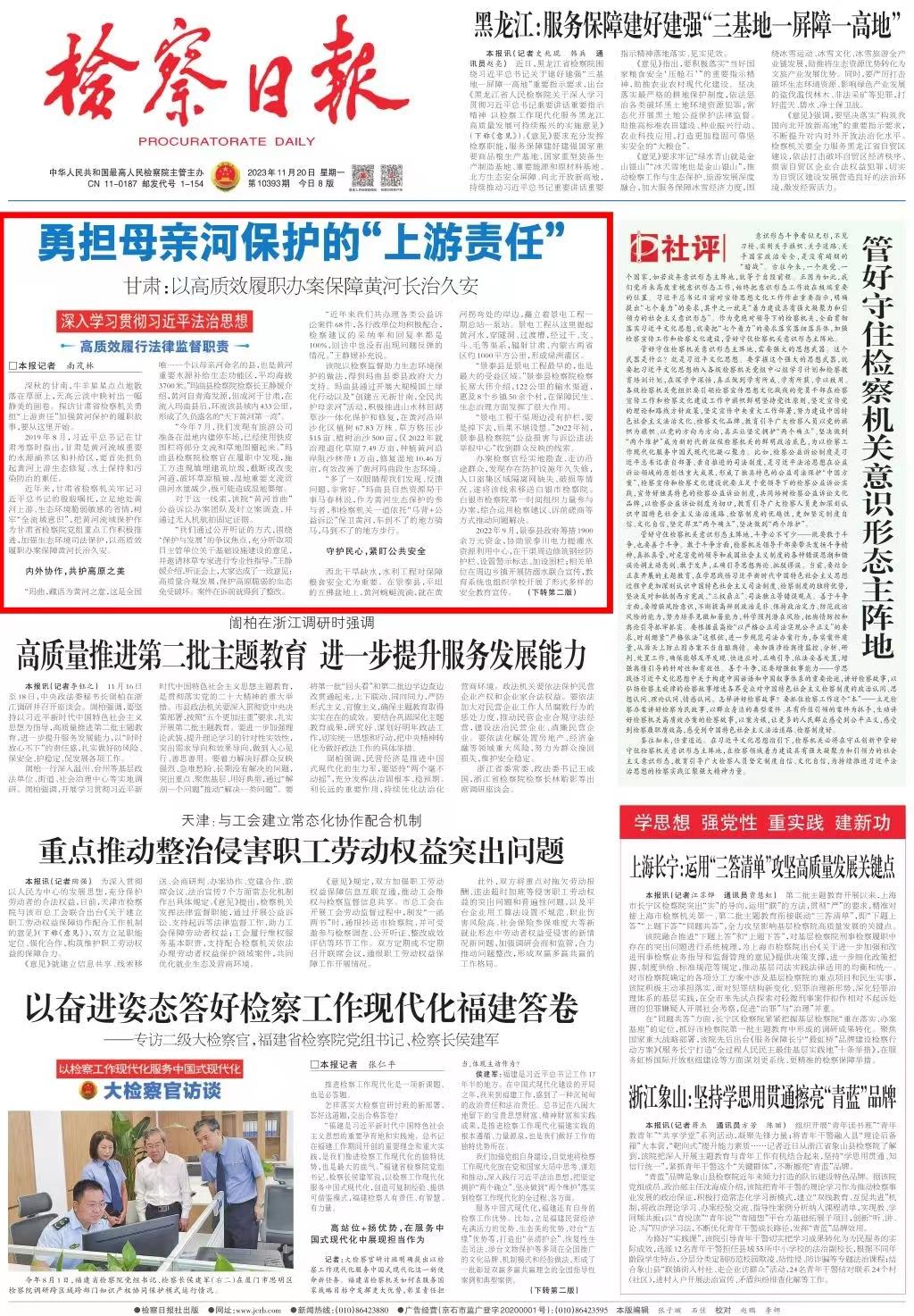 2023年11月20日,检察日报头版头条刊发《勇担母亲河保护的“上游责任”——甘肃:以高质效履职办案保障黄河长治久安》。