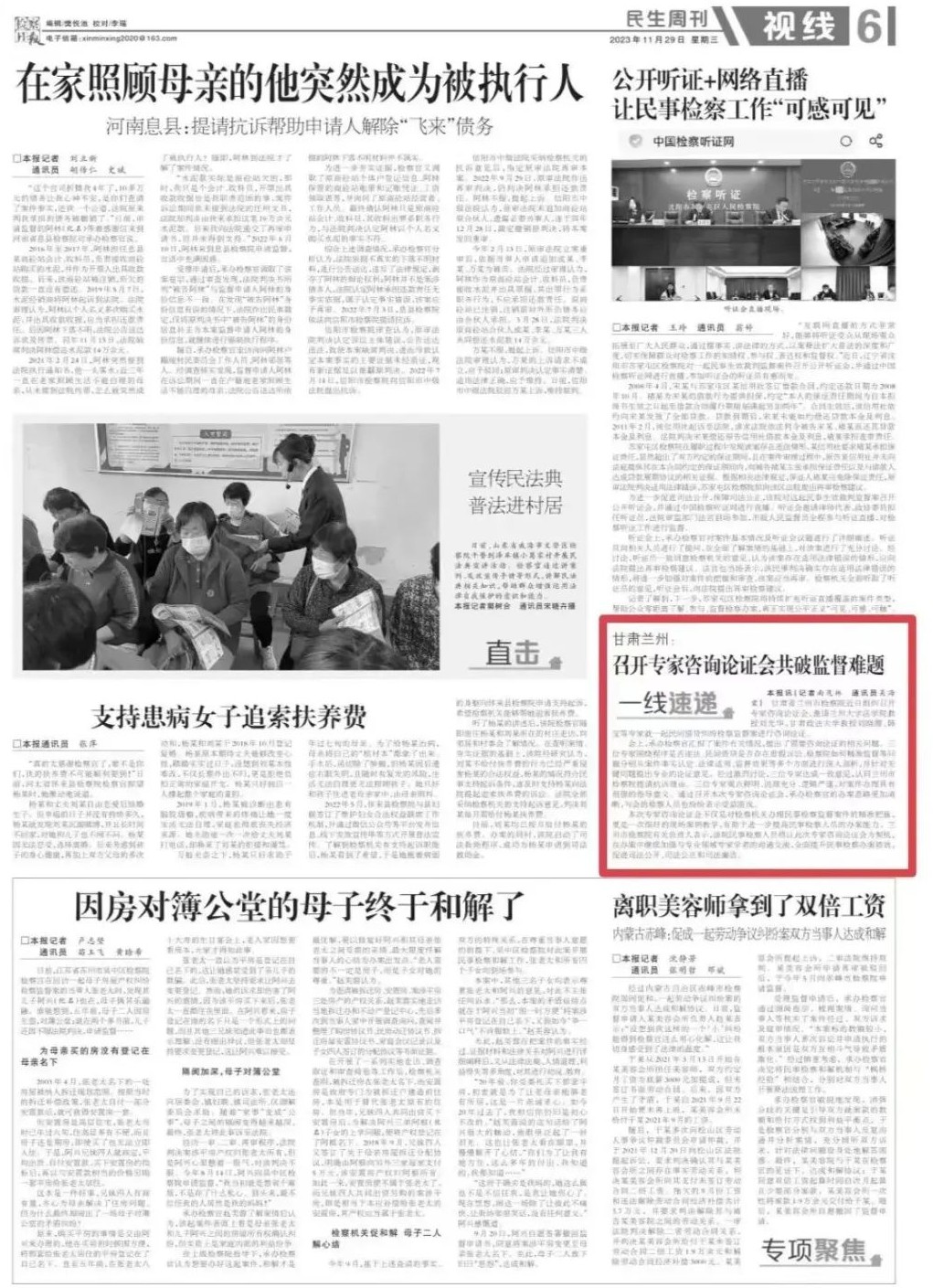 2023年11月29日,检察日报民生周刊刊发《甘肃兰州:召开专家咨询论证会共破监督难题》。