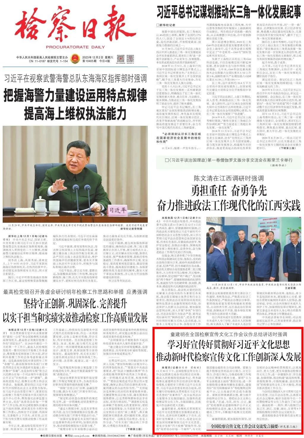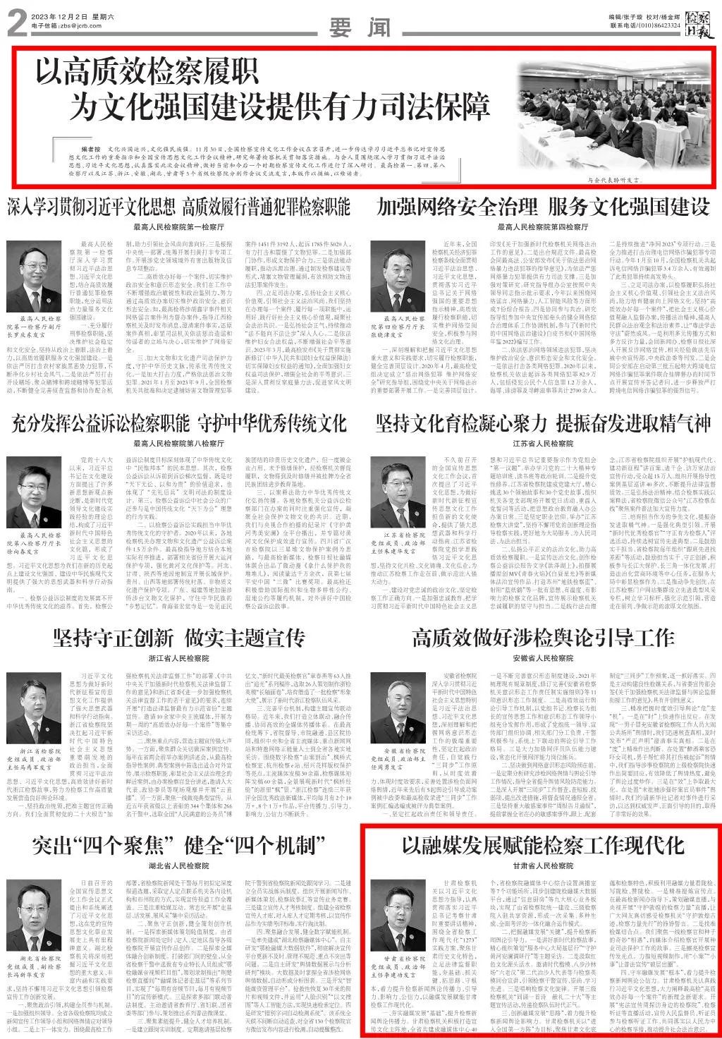 2023年12月2日,检察日报刊发《以高质效检察履职 为文化强国建设提供有力司法保障》,刊载全国检察宣传文化工作会议交流发言摘要。