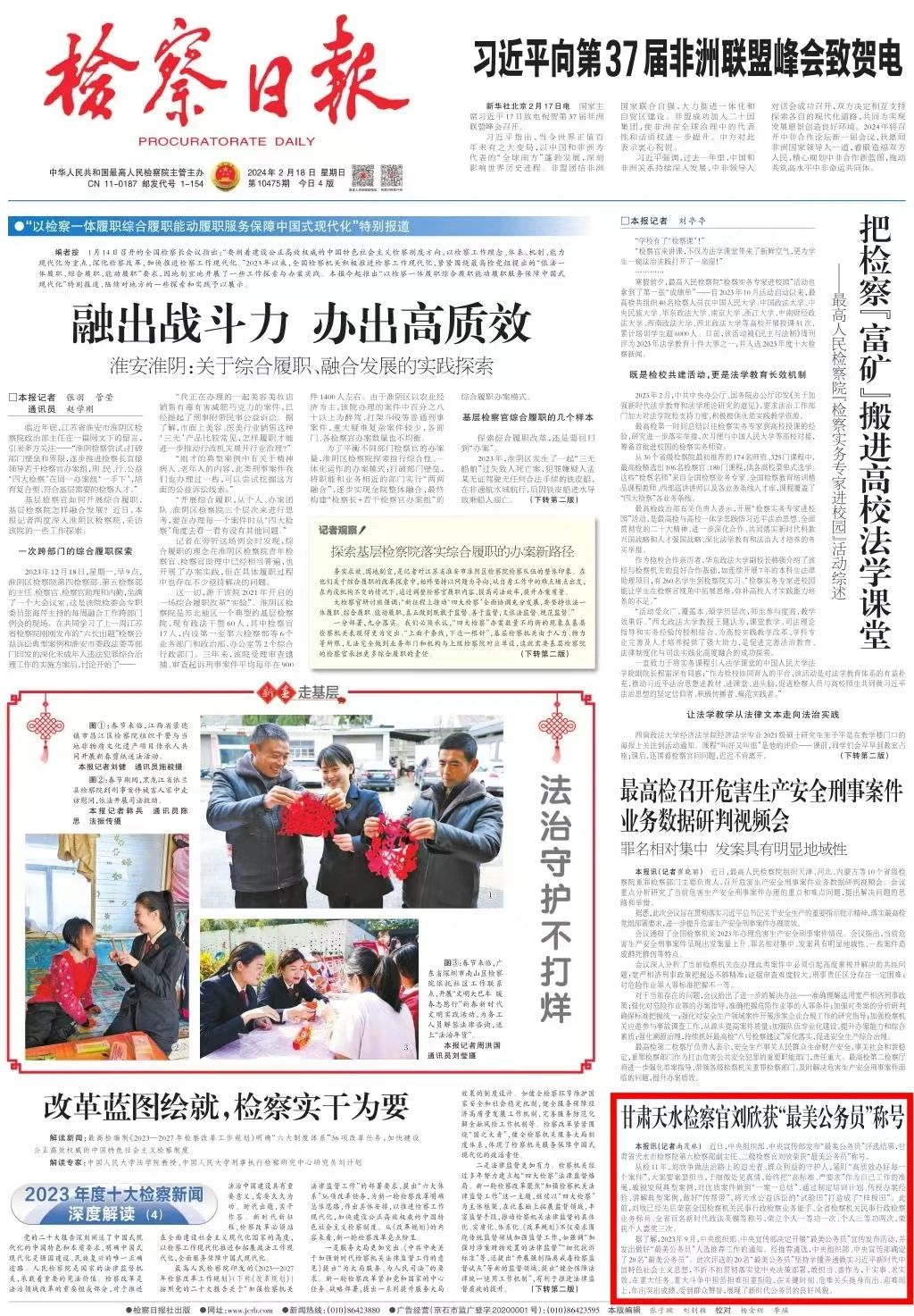 2024年2月18日,检察日报头版刊发《甘肃天水检察官刘欣获“最美公务员”称号》。