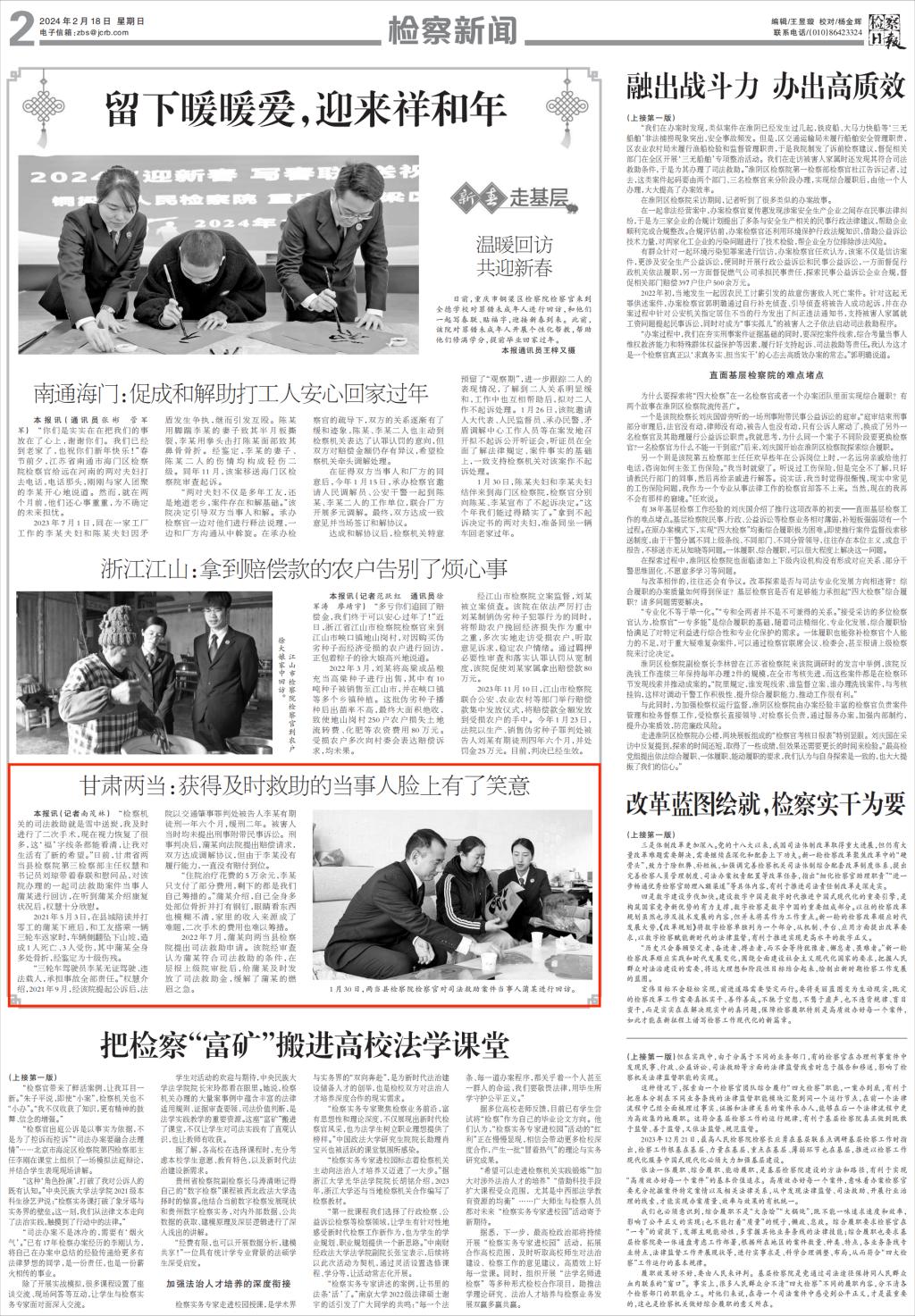 2024年2月18日,检察日报二版刊发《甘肃两当:获得及时救助的当事人脸上有了笑意》。