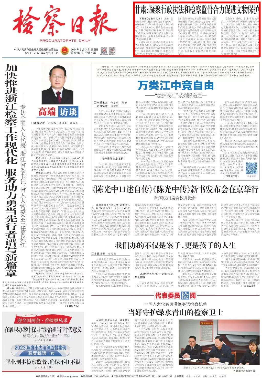 2024年3月3日,检察日报头版刊发《甘肃:凝聚行政执法和检察监督合力促进文物保护》。