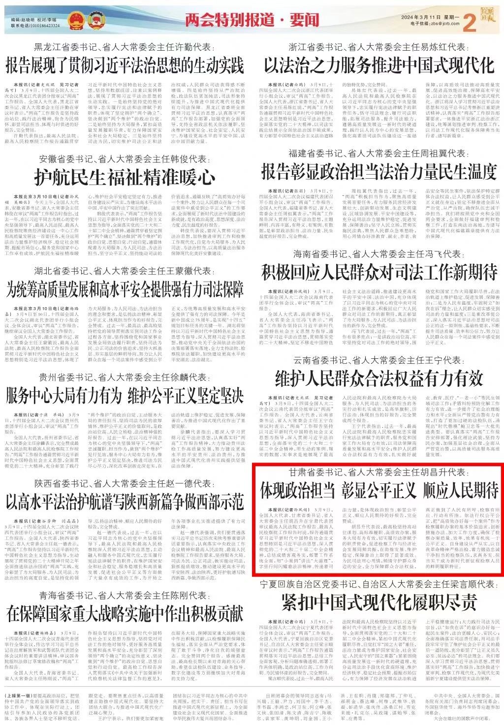 2024年3月11日,检察日报两会特别报道·要闻刊发《甘肃省委书记、省人大常委会主任胡昌升代表:体现政治担当 彰显公平正义 顺应人民期待》。