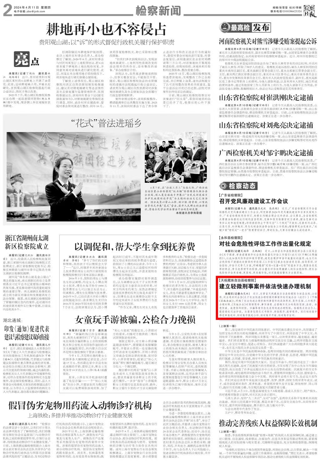 2024年4月11日,检察日报刊发《天祝藏族自治县检察院:建立轻微刑事案件依法快速办理机制》。