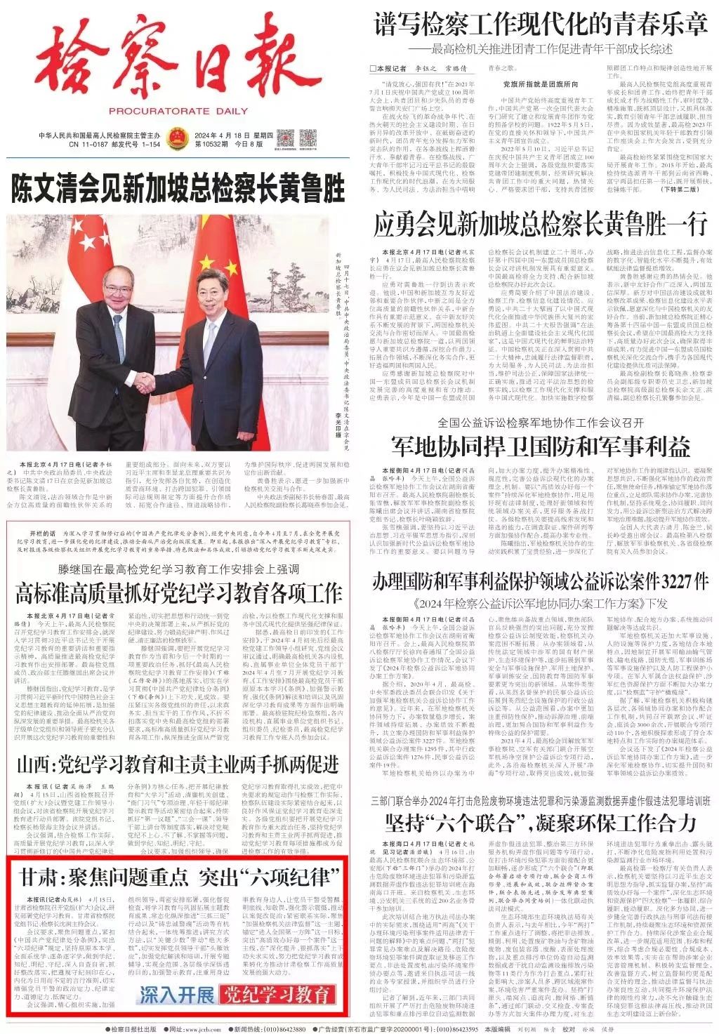 2024年4月18日,检察日报头版刊发《甘肃:聚焦问题重点 突出“六项纪律”》。