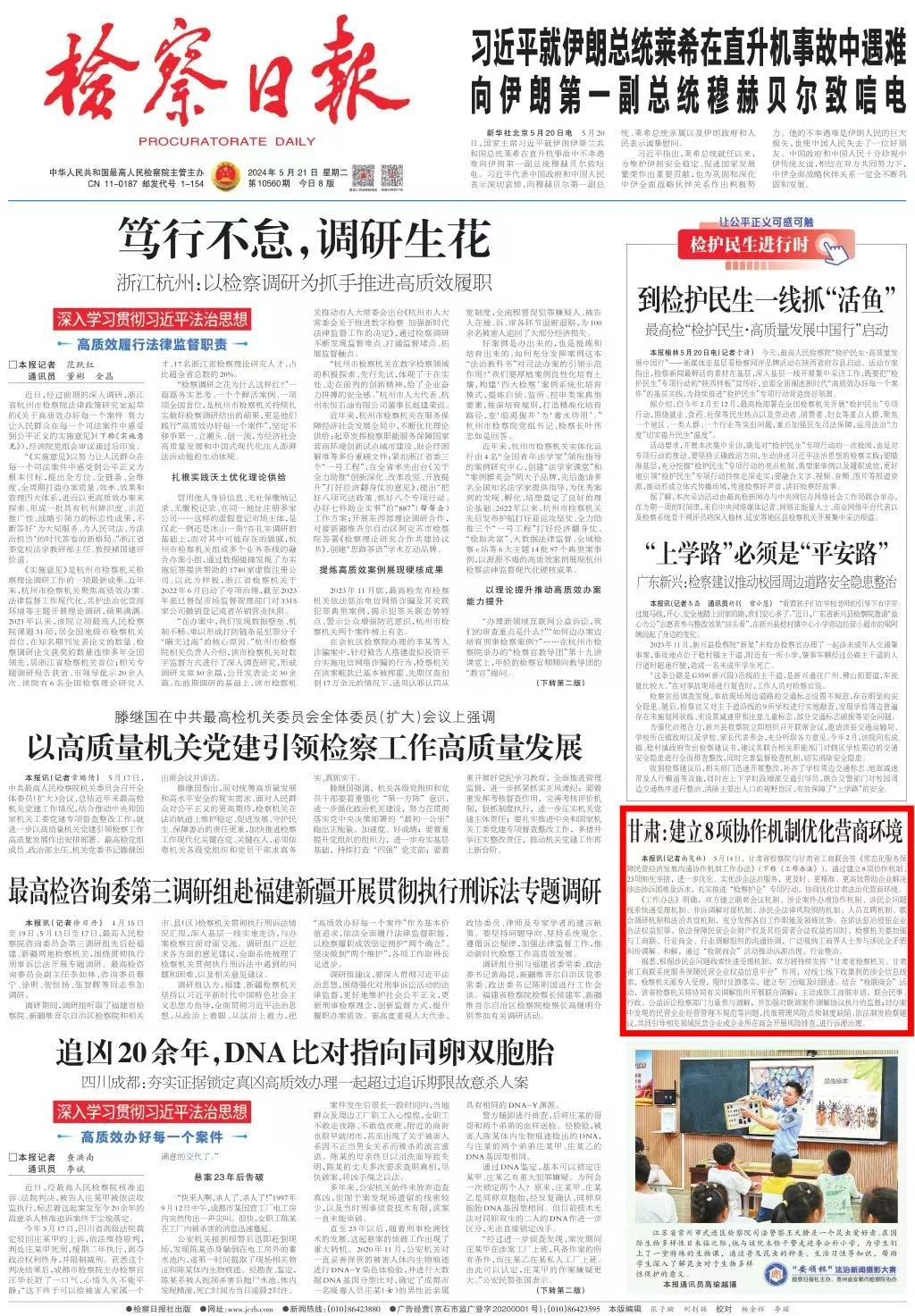 2024年5月21日,检察日报头版刊发《甘肃:建立8项协作机制优化营商环境》。