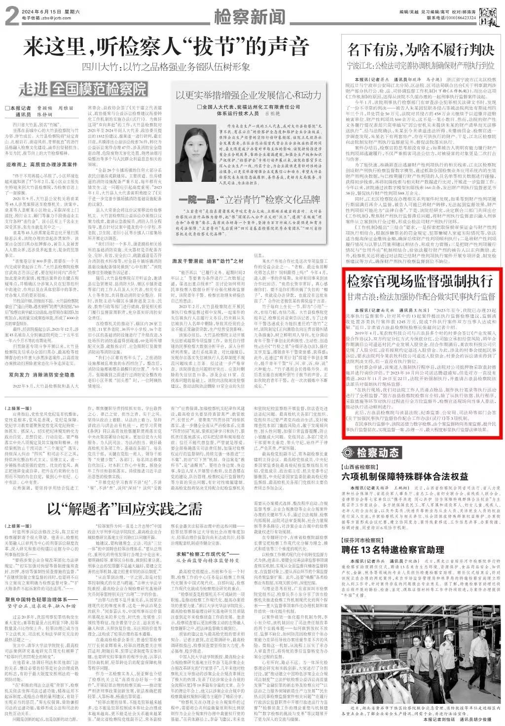 2024年6月15日,检察日报刊发《检察官现场监督强制执行——甘肃古浪:检法加强协作配合做实民事执行监督》。