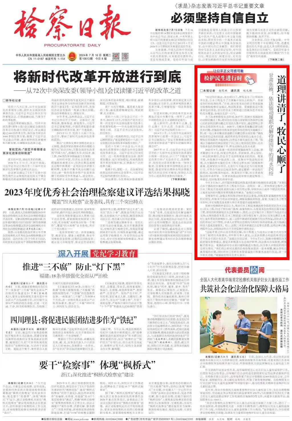 2024年7月16日,检察日报头版刊发《道理讲清了,牧民心顺了——甘肃张掖:依法能动履职化解持续四年的用水纠纷》。