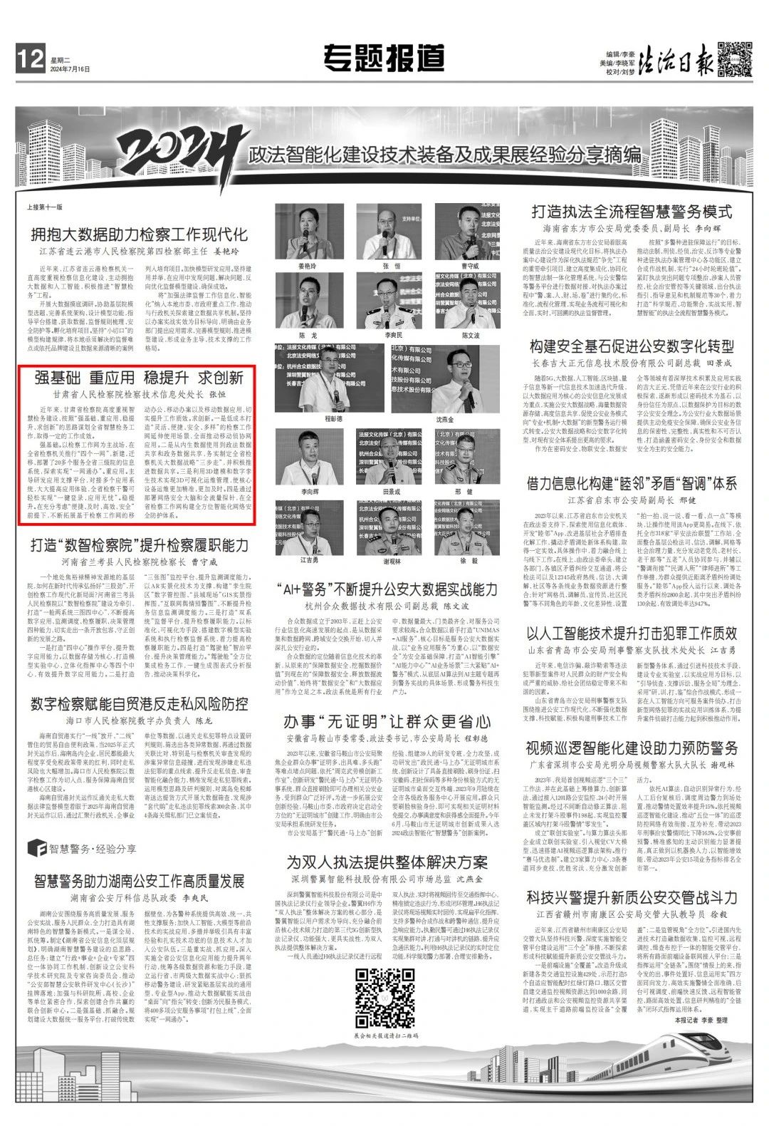 2024年7月16日,法治日报2024政法智能化建设技术装备及成果展经验分享摘编专题报道刊发甘肃经验分享《强基础 重应用 稳提升 求创新》。