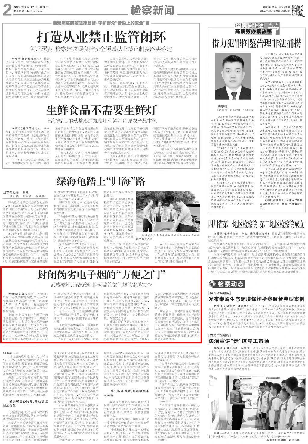 2024年7月17日,检察日报刊发《封闭伪劣电子烟的“方便之门”——武威凉州:诉源治理推动监管部门规范寄递安全》。