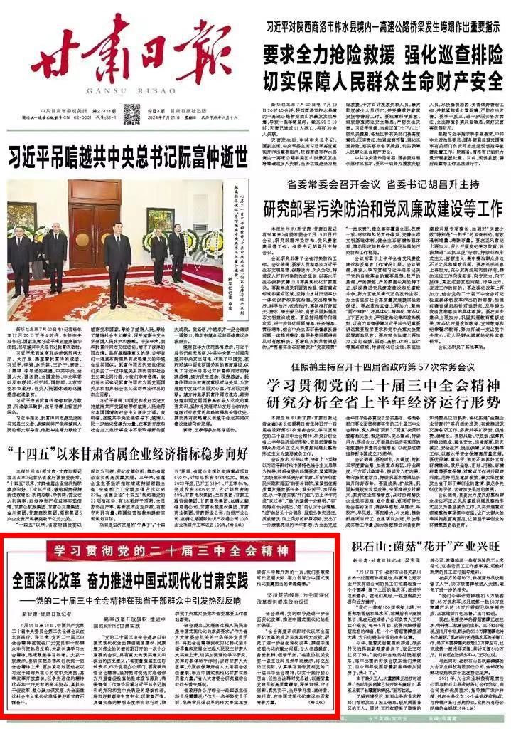 2024年7月21日,甘肃日报头版刊发《全面深化改革 奋力推进中国式现代化甘肃实践——党的二十届三中全会精神在我省干部群众中引发热烈反响》。